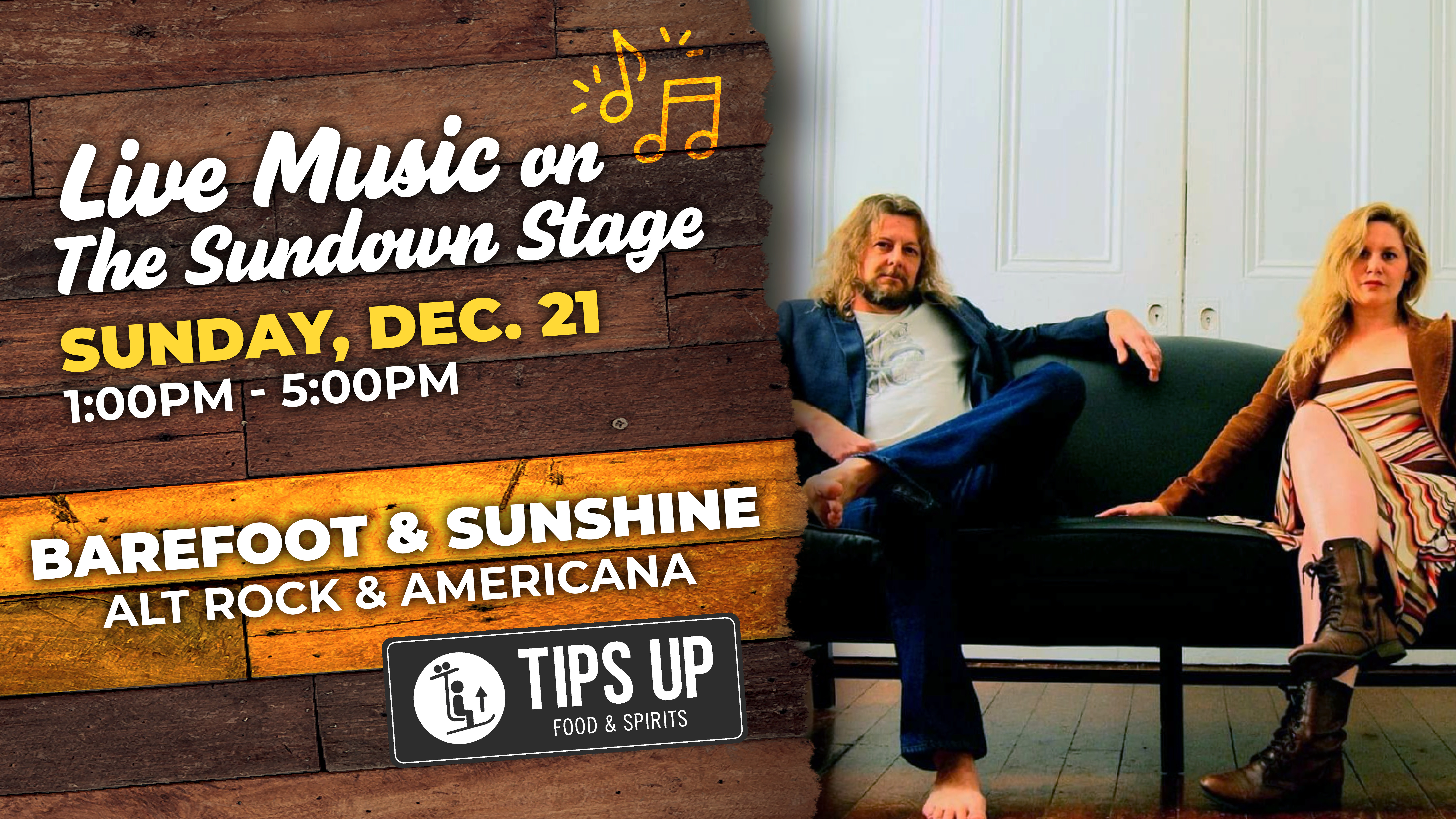 Barefoot & Sunshine return to the Sundown Stage! Come on out and enjoy the slopes and listen to some good tunes at Tips Up. |
